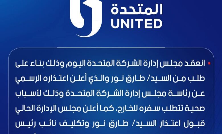 اكد بيان صادر عن الشركة المتحدة انه ” انعقد مجلس إدارة الشركة المتحدة اليوم وذلك بناء على طلب من السيد/ طارق نور والذي أعلن اعتذاره الرسمي عن رئاسة مجلس إدارة الشركة المتحدة وذلك لأسباب صحية تتطلب سفره للخارج، كما أعلن مجلس الإدارة الحالي قبول اعتذار السيد/ طارق نور وتكليف نائب رئيس مجلس الإدارة الحالي السيد/ محمد السعدي قائما بأعمال رئيس مجلس الإدارة
