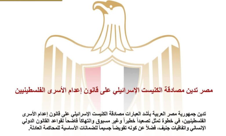 تدين جمهورية مصر العربية بأشد العبارات مصادقة الكنيست الإسرائيلي على قانون إعدام الأسرى الفلسطينيين، في خطوة تمثل تصعيداً خطيراً وغير مسبوق وانتهاكاً فاضحاً لقواعد القانون الدولي الإنساني واتفاقيات جنيف، فضلاً عن كونه تقويضاً جسيماً للضمانات الأساسية للمحاكمة العادلة.