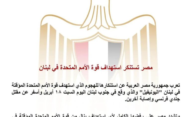 وتشدد مصر على رفضها الكامل لأي استهداف ينال من قوة الأمم المتحدة المؤقتة في لبنان، وتؤكد على ضرورة تمكين قوات اليونيفيل من الاضطلاع بمهامها لتحقيق الأمن والاستقرار في لبنان الشقيق.