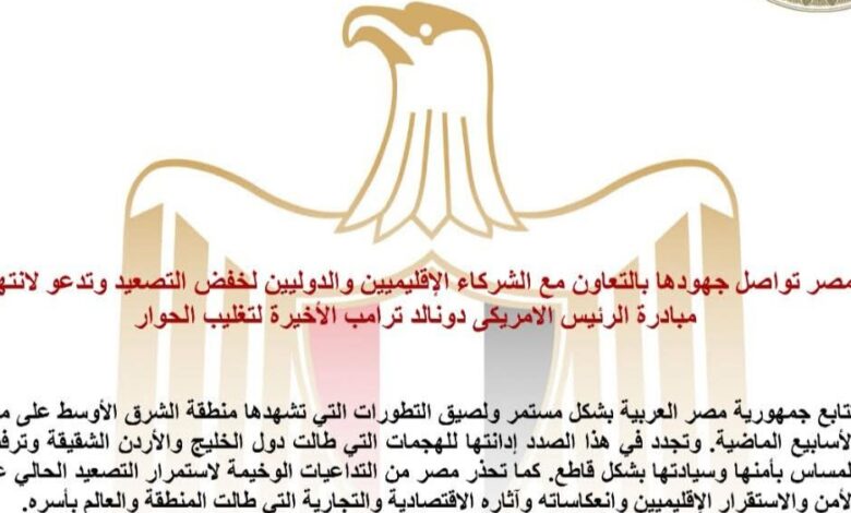 من هذا المنطلق، ترحب مصر بكافة الجهود والمبادرات التي من شأنها خفض التصعيد وحدة التوتر وبما يمهد لخفض التصعيد وإنهاء الحرب. وتثمن مصر في هذا الإطار تصريحات الرئيس الأمريكي دونالد ترامب اليوم، والتى أشار فيها إلى الاتصالات المكثفة لخفض التصعيد واعتزامه وقف خططته لاستهداف منشآت الطاقة الإيرانية. وتقدر مصر أهمية انتهاز هذه الفرصة والبناء عليها لتغليب الحوار لوقف التصعيد وصولا لإنهاء الحرب.