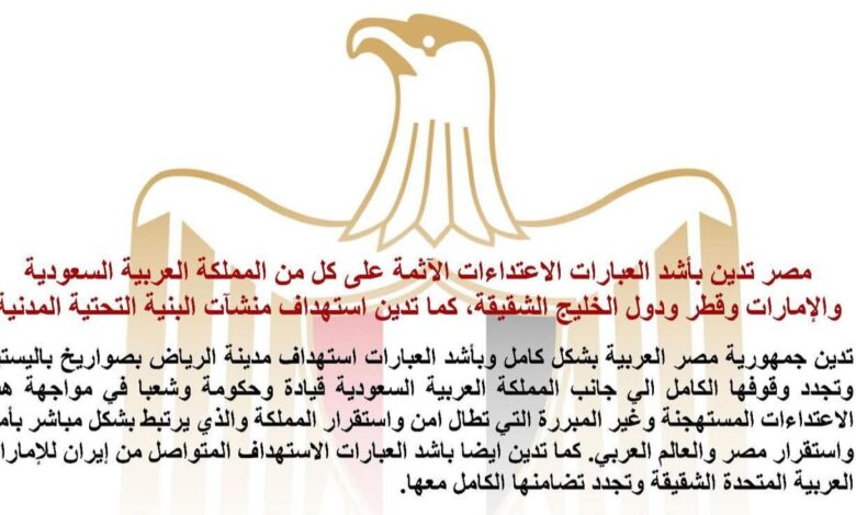 وتؤكد مصر إدانتها القاطعة لأي تهديدات أو محاولات لاستهداف المنشأت النفطية أو الغاز في دول الخليج العربي الشقيقة، بما في ذلك منشآت الغاز الطبيعي المسال في رأس لفان بقطر. وتوكّد مصر وقوفها الكامل إلى جانب قطر الشقيقة في مواجهة أي اعتداءات آثمة.