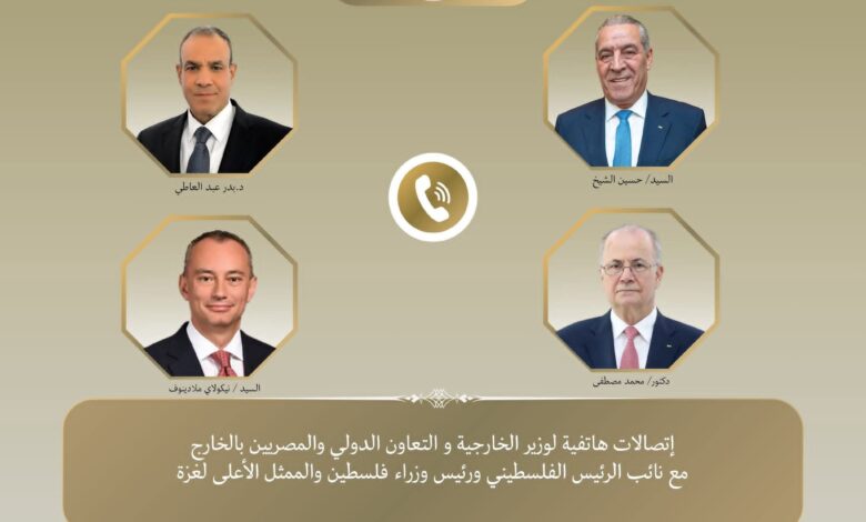 جرت اتصالات هاتفية بين د. بدر عبد العاطي وزير الخارجية والتعاون الدولي والمصريين بالخارج، مع كل من السيد حسين الشيخ نائب الرئيس الفلسطيني، والدكتور محمد مصطفى رئيس الوزراء الفلسطيني، والسيد نيكولاي ملادينوف الممثل الأعلى لغزة، وذلك لبحث مستجدات القضية الفلسطينية والأوضاع في قطاع غزة والضفة الغربية.