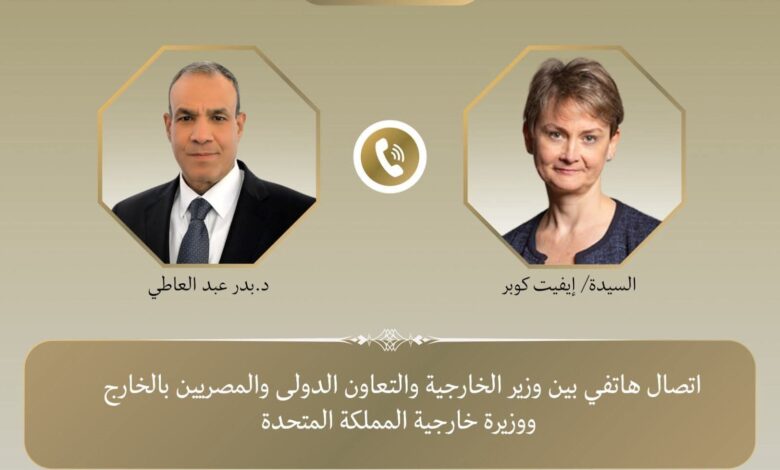 تلقى د. بدر عبد العاطي وزير الخارجية والتعاون الدولي والمصريين بالخارج اتصالاً هاتفياً من السيدة “إيفيت كوبر”، وزيرة خارجية المملكة المتحدة، اليوم ، وذلك في إطار التشاور الدوري بين الجانبين، حيث تناولا سبل تعزيز العلاقات المصرية البريطانية، ومستجدات الأوضاع في المنطقة في ظل المفاوضات الأمريكية – الإيرانية في إسلام آباد، بالاضافة إلى التطورات في قطاع غزة ولبنان والسودان.