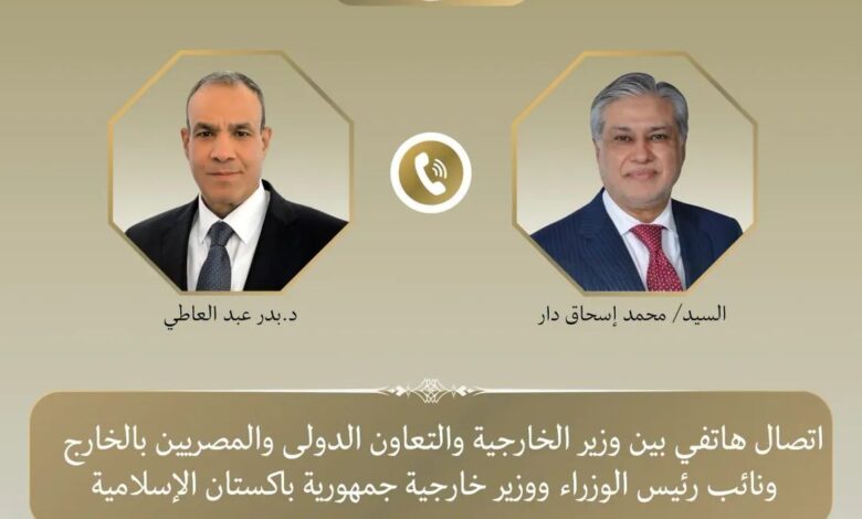 تلقى د. بدر عبد العاطى وزير الخارجية والتعاون الدولي والمصريين بالخارج اتصالاً هاتفياً من السيد محمد إسحاق دار نائب رئيس الوزراء وزير خارجية جمهورية باكستان الإسلامية اليوم ، وذلك فى إطار التشاور والتنسيق بين البلدين للوقوف على آخر مستجدات الوضع الإقليمي وتنسيق الجهود المشتركة.