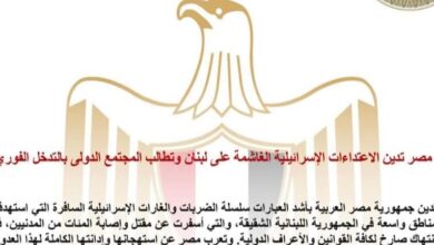 مصر تدين الاعتداءات الإسرائيلية الغاشمة على لبنان وتطالب المجتمع الدولى بالتدخل الفوري